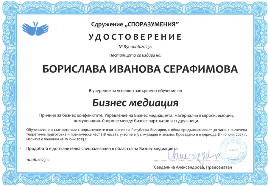 Казвам се Борислава Серафимова и съм адвокат-медиатор от град София.